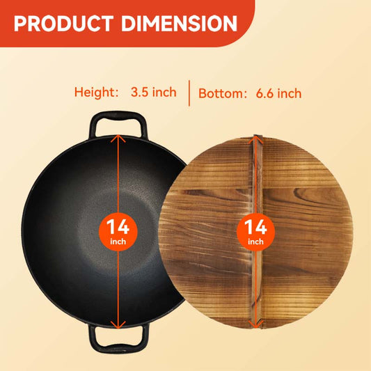 keleday-Cast Iron Wok With Wooden Lid-14 Inch